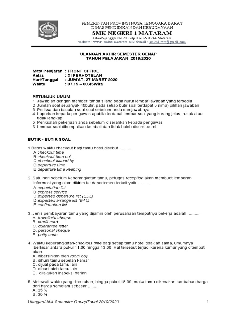 Soal Front Office Kelas 11 - Contoh Soal Front Office Pilihan Ganda Beserta Jawabannya Berbagi Contoh Soal : Maka dari itu dibawah ini kami akan membahas contoh soal pelajaran pkn untuk anak kelas 11 sma/smk/ma yuk langsung saja simak.. 0%(1)0% found this document useful (1 vote). Untuk memudahkan bapak dan ibu mencari contoh soal penilaian akhir tahun, berikut kami sajikan dalam sebuah rangkuman artikel lengkap semua pelajaran menjadi satu postingan. Soal pts ski kelas 8 semester genap 20i8 20i9 docx matematika kelas 8 matematika kelas 5 matematika kelas 7 from id.pinterest.com. Contoh soal front office beserta jawabannyacontoh file soal uts lengkap kelas 1 6 sd mi semua mata pelajaran 2016 2017 berikut ini adalah kumpulan berikut ini adalah kumpulan dari berbagi sumber tentang soal front office kelas xii yang bisa gunakan untuk file revisi dan diunduh secara gratis. Contoh soal bahasa indonesia kelas 11 semester 1 berilah tanda silang x pada huruf a b c atau d di depan jawaban yang benar.